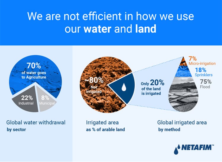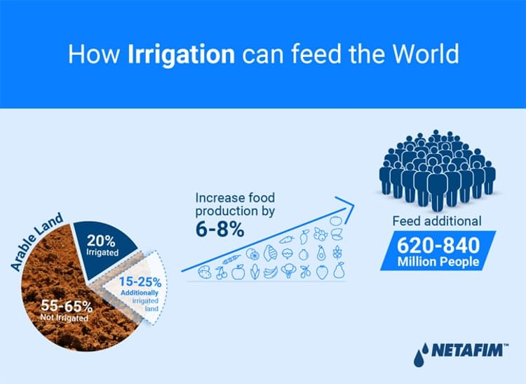 According to recent research from the University of Berkeley California, humanity has an immediate ability to expand irrigation to 15-25% of the rainfed agricultural land increasing our global food production by 6-8%. That will feed an additional 620-840 million people. Irrigation delivers predictability and stability and is the most immediate way we can increase productivity and mitigate risk.
