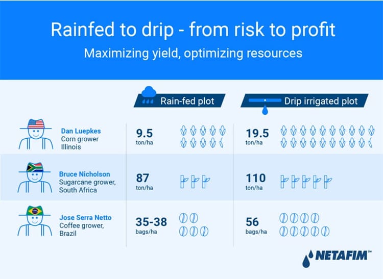 Let’s take for example three farmers in the U.S corn belt who converted some of their corn fields from rainfed to drip irrigation. Dan Luepkes from Illinois used drip successfully to irrigate some of his worst quality lands and was able to maximize income on every hectare. His corn yield grew from 9.5ton/ha on the rain-fed plot to 19.5ton/ha on the drip-irrigated plot. In North Carolina, Kevin Matthews went from 9ton/ha (on a rain-fed plot) to 19ton/ha (on a drip-irrigated plot) and said he “…doubled the yield, but only had to seed one time.” Kelly Garret from Iowa also started using drip irrigation in 2016. He summarized the experience by saying that “You don’t need to buy more land, you don’t need to buy more seeds. Worst-case scenario, you need another truck to haul away the bushels, that’s a wonderful problem!”
