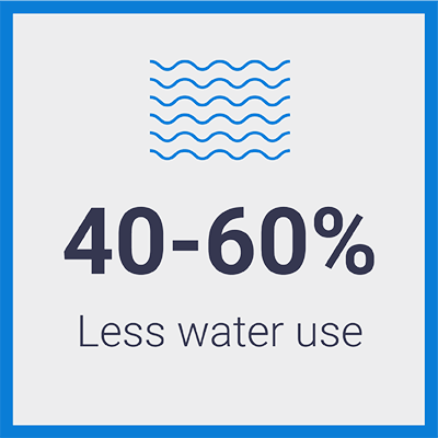 Drip irrigation uses 45% less water than micro sprayers, and 60% less water than sprinklers because it delivers the water directly to the plant roots. Other irrigation systems spray the plant canopy and the evaporated water is wasted.