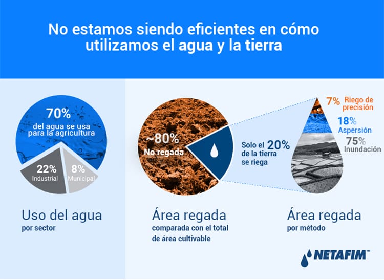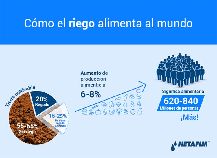 Según una investigación reciente de la Universidad de Berkeley California, la humanidad tiene una capacidad inmediata para expandir el riego al 15-25% de los cultivos de temporal, lo que aumenta nuestra producción mundial de alimentos en un 6-8%. Eso alimentará a 620-840 millones de personas más. El riego tecnificado ofrece previsibilidad y estabilidad y es la forma más inmediata en que podemos aumentar la productividad y mitigar el riesgo.