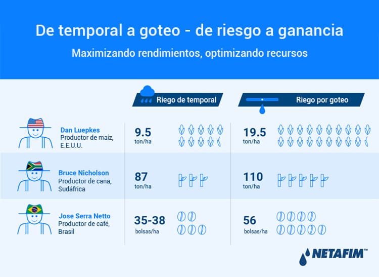 Tomemos, por ejemplo, a tres agricultores del cinturón de maíz de EE. UU. Que convirtieron algunos de sus campos de maíz de temporal a riego por goteo. Dan Luepkes de Illinois utilizó el goteo con éxito para regar algunas de sus tierras de peor calidad y pudo maximizar los ingresos en cada hectárea. Su rendimiento de maíz creció de 9.5 ton / ha en la parcela de temporal a 19.5ton / ha en la parcela irrigada por goteo. En Carolina del Norte, Kevin Matthews pasó de 9 toneladas / ha (en una parcela de temporal) a 19 toneladas / ha (en una parcela irrigada por goteo) y dijo que "... duplicó el rendimiento, pero solo tuvo que sembrar una vez". Kelly Garret de Iowa también comenzó a usar el riego por goteo en 2016. Resumió la experiencia diciendo que “no es necesario comprar más tierra, no es necesario comprar más semillas. En el peor de los casos, necesita otro camión para transportar tanto maíz ¡es un problema maravilloso!"