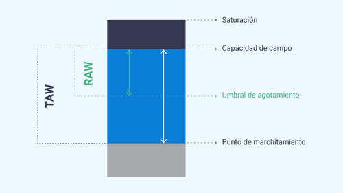 En la actualidad, estas herramientas se han vuelto indispensables en la agricultura de precisión, ya que nos brindan datos cruciales sobre la humedad de nuestro sustrato, como el punto de marchitez permanente, la capacidad de campo y el punto de saturación. Además, nos permiten calcular el Agua Total Disponible (TAW), que representa la cantidad de agua almacenada en el suelo entre la capacidad de campo y el punto de marchitez, disponible para ser absorbida por la planta. El Umbral de Agotamiento, por otro lado, establece el nivel mínimo de contenido de agua dentro del intervalo TAW, y este umbral varía según el cultivo y la etapa de desarrollo de la planta. También consideramos el Agua Fácilmente Disponible (RAW), que es el agua accesible para las plantas entre la capacidad de campo y el umbral de agotamiento definido.