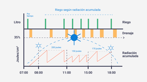 Una tecnología adicional utilizada en la hidroponía es el riego por radiación, que adapta los pulsos de riego en función de la intensidad solar. Este método utiliza un piranómetro para medir la radiación solar en watts por metro cuadrado (W/m2) y calcula los pulsos de riego en función de la radiación acumulada en joules por centímetro cuadrado (J/cm2). Esta tecnología garantiza que los pulsos de riego se adapten a las necesidades de la planta, incluso en condiciones variables de luz solar, lo que resulta en un uso más eficiente del agua, los fertilizantes y la energía. En última instancia, estas innovaciones tecnológicas ayudan a los agricultores a tomar decisiones más informadas y a maximizar la productividad y rentabilidad de sus cultivos.