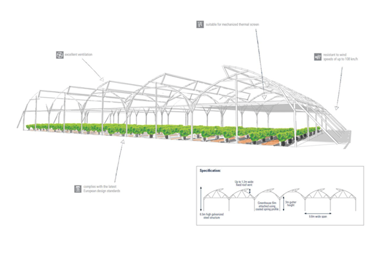 It can withstand wind speeds of up to 108 km/h and features excellent ventilation capabilities for optimal growing environment. The mechanized thermo and shading screens  help reduce  heat inside the structure while allowing pollinating bees to operate inside the structure A wide span of 9.6m gives farmers easy access to berry picking without damaging the crops.